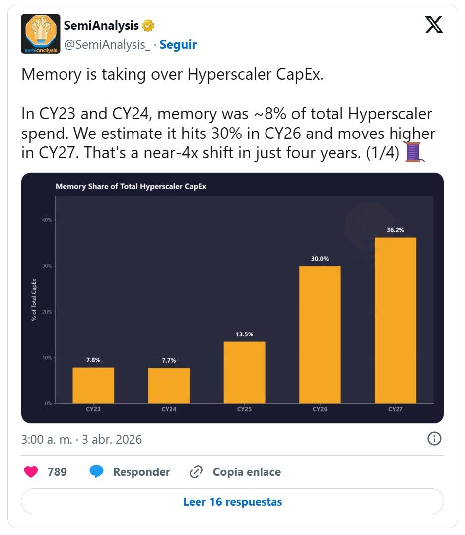 El coste de la memoria pasará de representar un 8% al 30% del gasto total de los hiperescalares en 2026. Esta tendencia refleja un cambio de paradigma donde el ancho de banda es ya tan crítico como la capacidad de procesamiento.